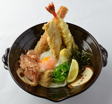 人気の天ぷらを載せたのど越し爽やかな冷やしうどんです。