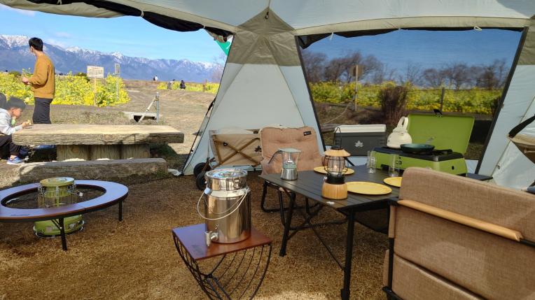 菜の花畑とグランピングテント、