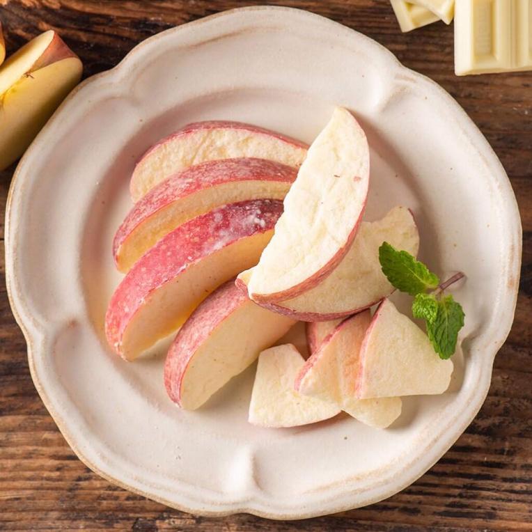 フリーズドライの青森県産りんごに、ホワイトチョコレートを中まで染みこませた、新食感のチョコスイーツです。
