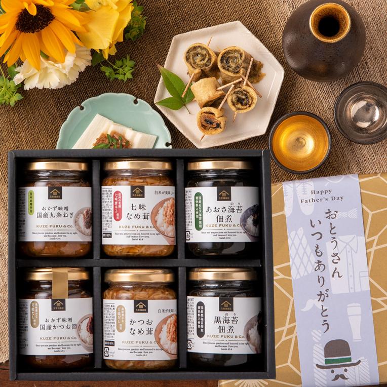 久世福商店で大人気の七味なめ茸、海苔バターなどの6種類のごはんのお供が入ったギフトです。