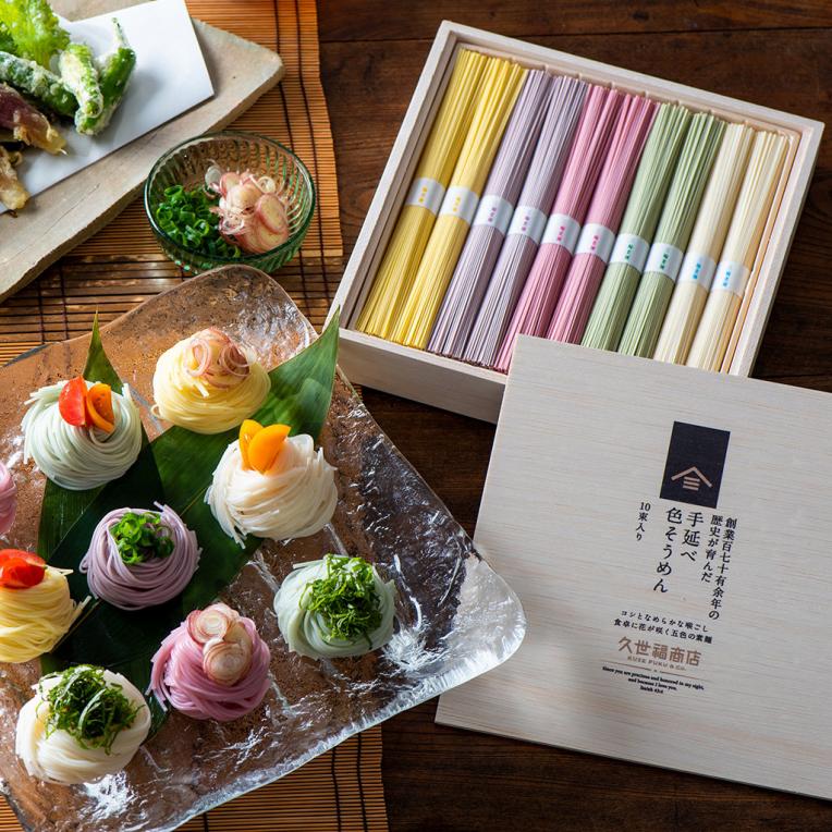 創業百七十有余年の歴史が育んだ 手延べ色そうめん 10束入り 【木箱入り/包装付】 税込価格: 2,592 円