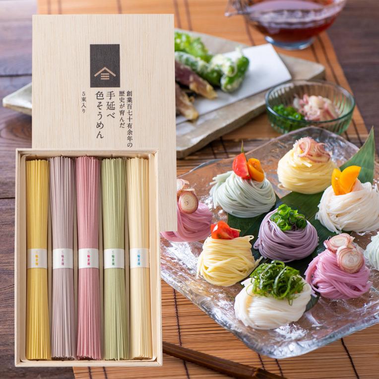 創業百七十有余年の歴史が育んだ 手延べ色そうめん 5束入り 【木箱入り/包装付】