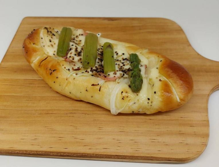ふんわり柔らかい当店オリジナルロール生地にオニオンをたっぷり敷いて、上にベーコンとアスパラをのせマヨネーズとペッパーで仕上げました。