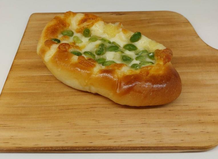 ふんわり柔らかい当店オリジナルロール生地に2種類のシュレーダーチーズを敷き詰めて、たっぷりゴロゴロと枝豆を所狭しとのせ、マヨネーズで仕上げてます。