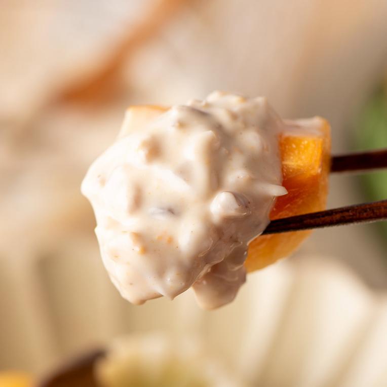 目にも鮮やかな甘味のある柿に、「いぶりがっこタルタル」の塩味とまろやかさがとても合います。