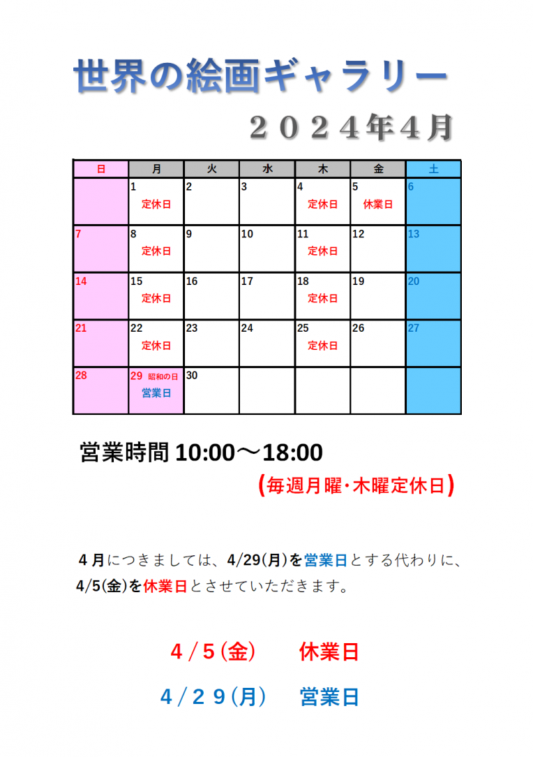 • 4月営業日・休日カレンダー 世界の絵画ギャラリーピエリ守山店