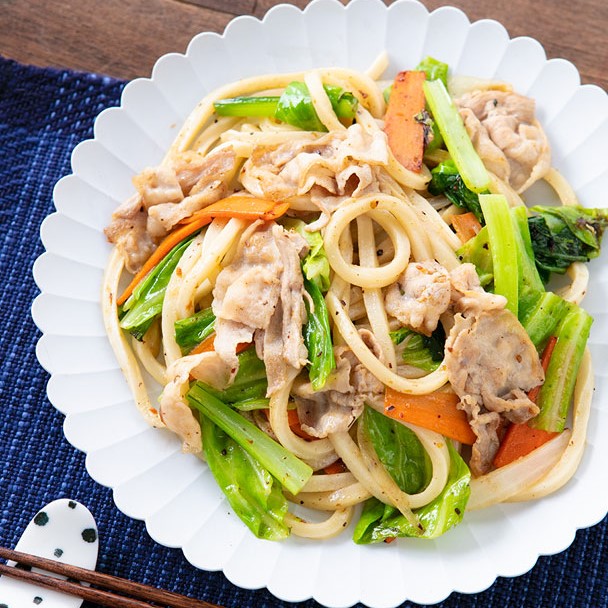 ▲うまみ感じる、焼きうどん(素材の、うまみ引き立つ。毎日だし)