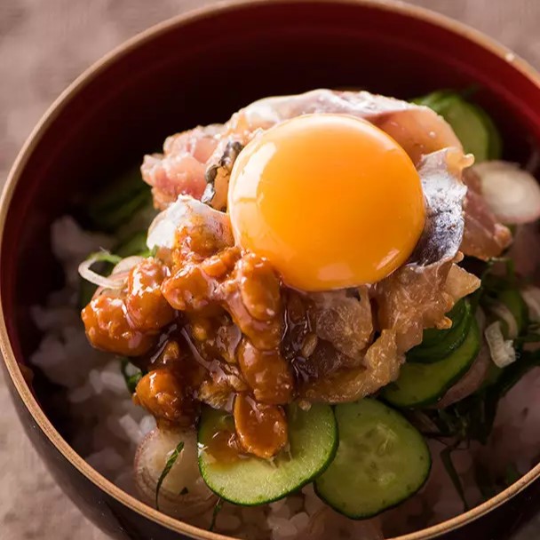 ▲混ぜるだけ!刺身のユッケ丼(食べる、だし醤油)