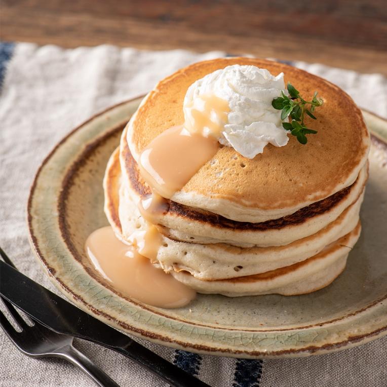 とろ~りなめらかな「バナナミルクの素」がホットケーキに絡みつき、バターとはまた違ったおいしさが楽しめますよ。