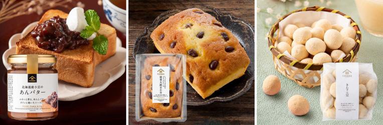 人気商品のあんバター、大納言のパウンドケーキ、きなこ豆。