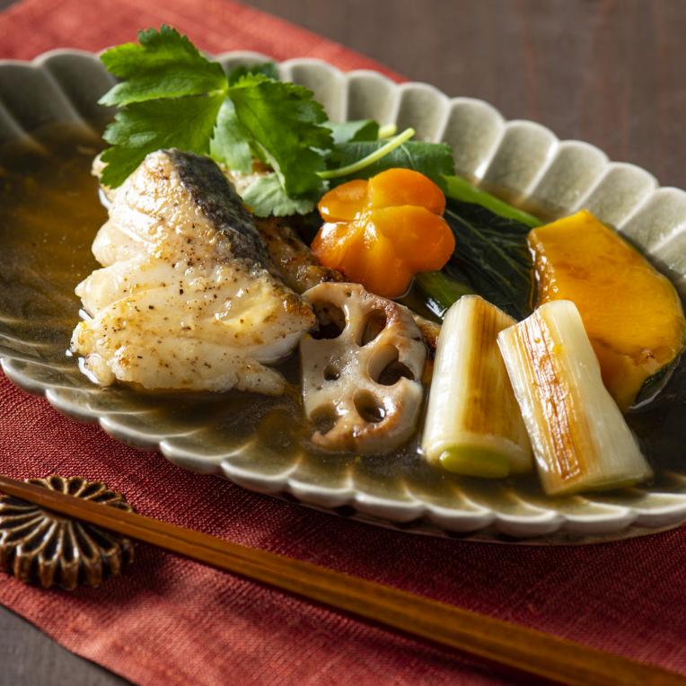 ❹フライパンに油を引き、鱈、ねぎ、かぼちゃ、れんこんを両面にこんがりと焼き色が付くまで焼く。