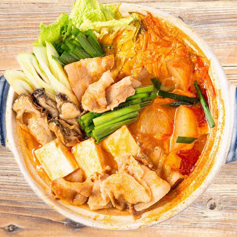 つぎに特製のスープとお好みの具材を加え、ピリ辛キムチ鍋に大変身!!