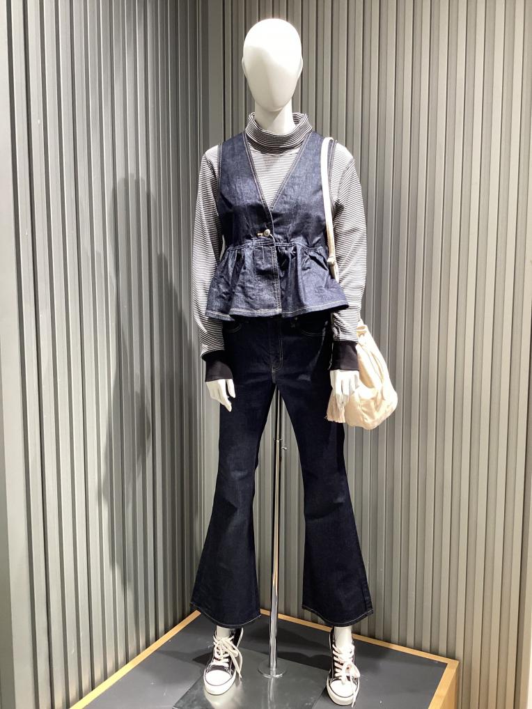 シンプルながら計算されたシルエットでスタイルアップが叶うデニムビスチェは、ニットやブラウス、Tシャツ、タンクトップなどにプラスするだけでおしゃれ見えする便利なアイテムです♪