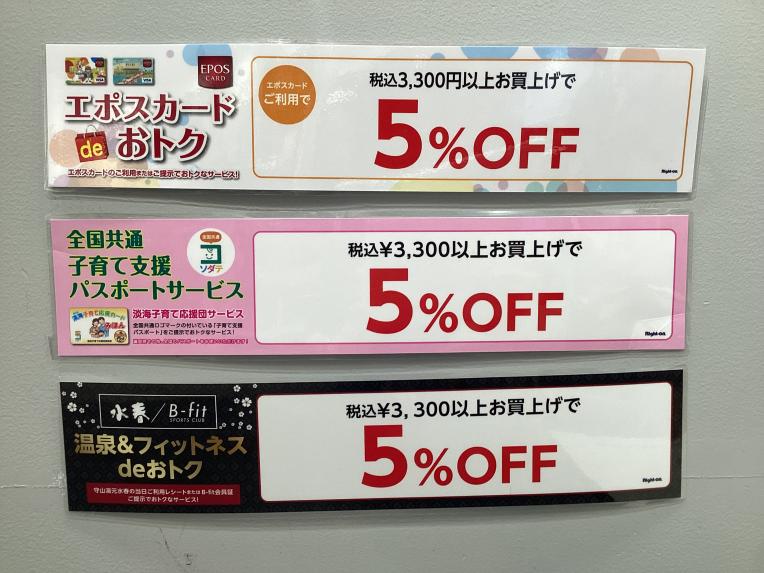 淡海子育て応援カードなど「全国共通子育て支援パスポート」をご提示で、税込み3,300円以上お買い上げで、5%OFFになります!!