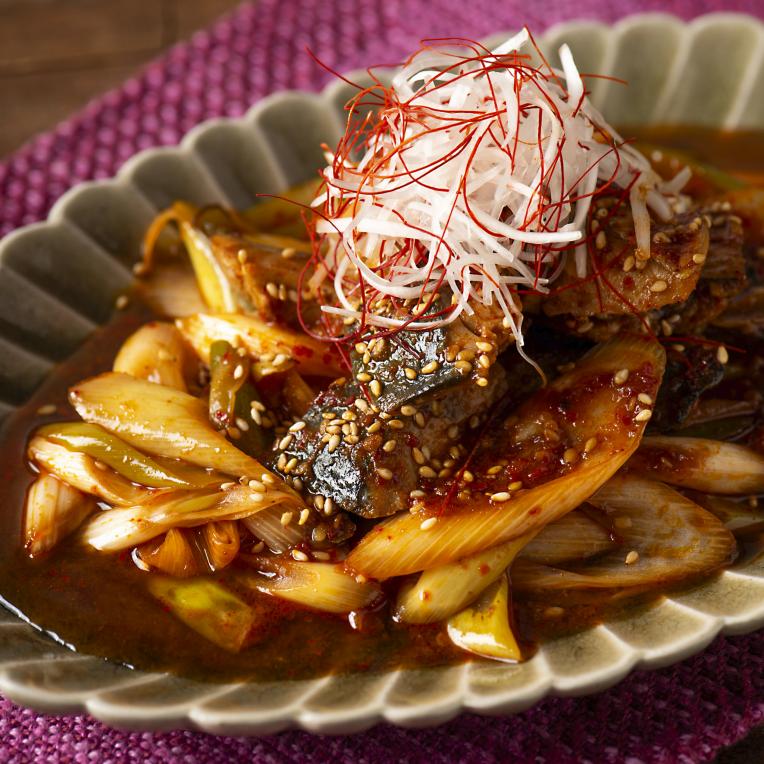 ❽皿にねぎ、さばをのせ、フライパンに残ったたれをかけ、白ごまを振り、①をのせる。