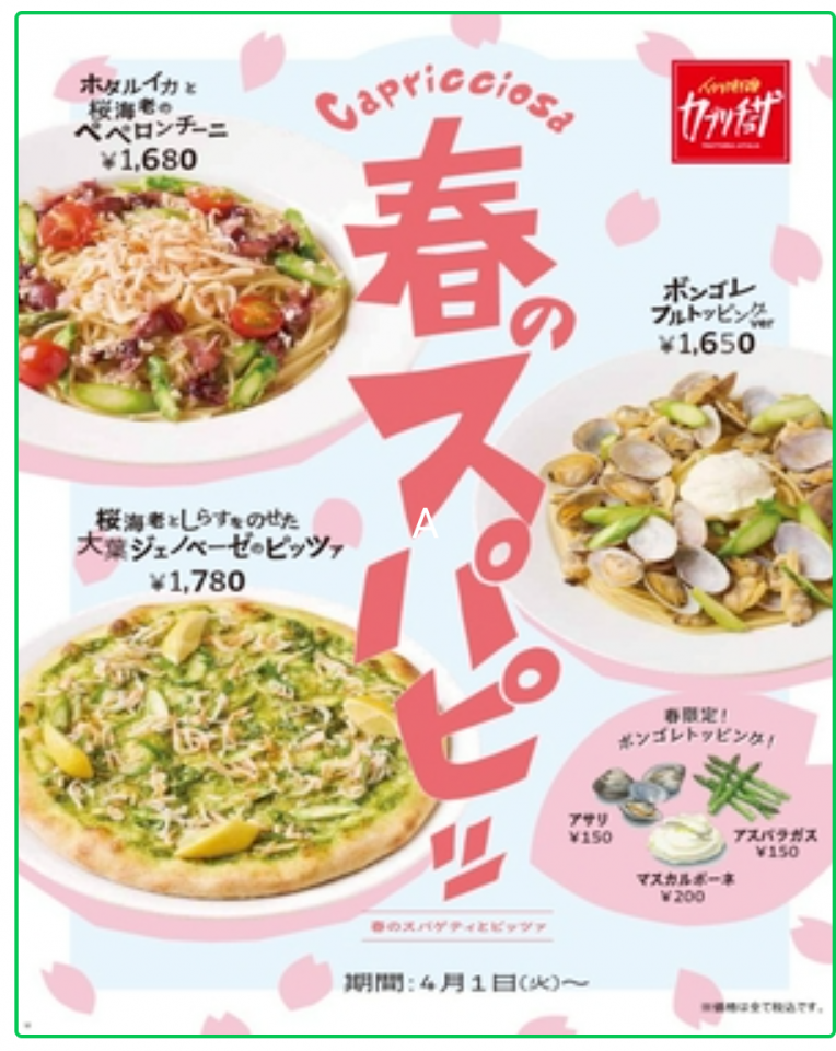 「ホタルイカと桜海老のペペロンチーニ」は、ホタルイカの旨味とアスパラのシャキシャキ感を活かしながら、オリーブオイルとガーリックの風味をスパゲティにまとわせ仕上げたペペロンチーニ。唐辛子のピリッとくる刺激と、桜海老の香ばしさがアクセントとなった、春の訪れを感じる軽やかな味わいをどうぞ。「大葉ジェノベーゼ 桜海老としらすのピッツア」は、大葉ジェノベーゼソースが食材の旨味を引き立て、春らしい爽やかで芳醇な味わいが広がります。レモンを搾ればフレッシュ感が加わり、味の変化を感じていただけます。「あさりのスープ仕立てスパゲティ(スパゲティボンゴレ)」のトッピングとしてご用意したのは、殻付きアサリ(2 倍増し)、アスパラガス、マスカルポーネチーズの3 種。お好みのカスタマイズで、春の味覚をたっぷりお楽しみ頂けます。季節の食材をふんだんに使ったスペシャルメニューが、春色のテーブルを演出します。旬の味覚をご堪能ください。