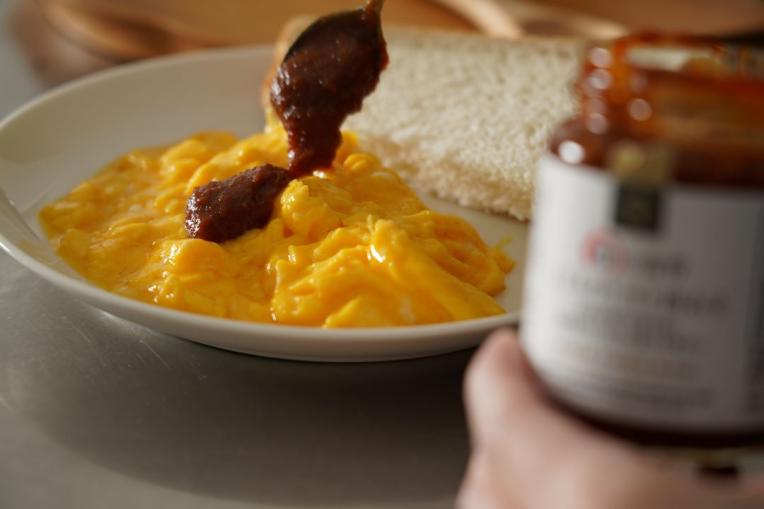 半熟のスクランブルエッグと甘酸っぱいトマト肉みその相性が抜群です!