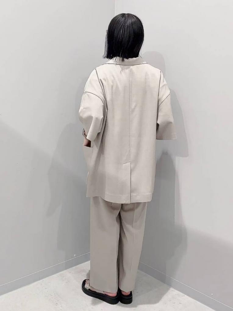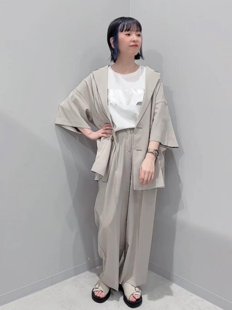 同素材のワイドパンツと合わせてセットアップの着こなし。