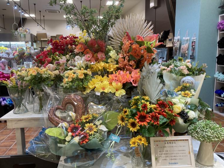 造花も夏の花に模様替えです!特にひまわりは元気が出ますね。造花で花束・アレンジメントお作りしています。お気軽にお問い合わせください!