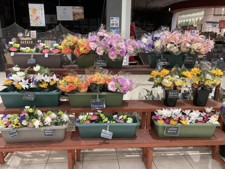 造花の仏花なら、この暑さでも大丈夫です!!多数商品ございます。ご来店お待ちしております♪