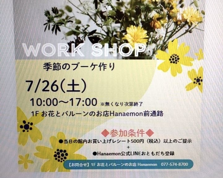 7月26日(土)、ハナエモン店舗前にてワークショップを開催します。季節の花のプチブーケ作りです。皆様のご参加、お待ちしております♪