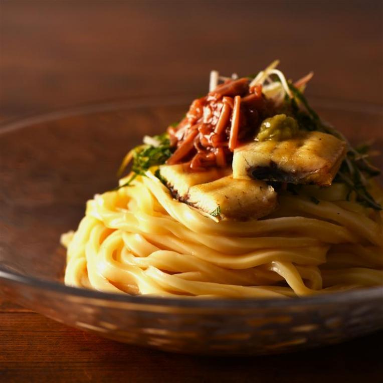 【さっぱり梅なめ茸と香味野菜の和えうどん 白焼きうなぎ添え】