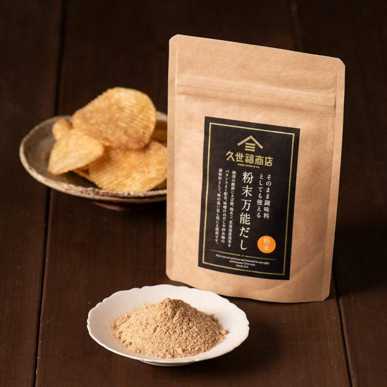 【店舗で「万能だしポテトチップス」をご購入の方に、「粉末万能だし(お試しサイズ)」を1袋プレゼント中!】