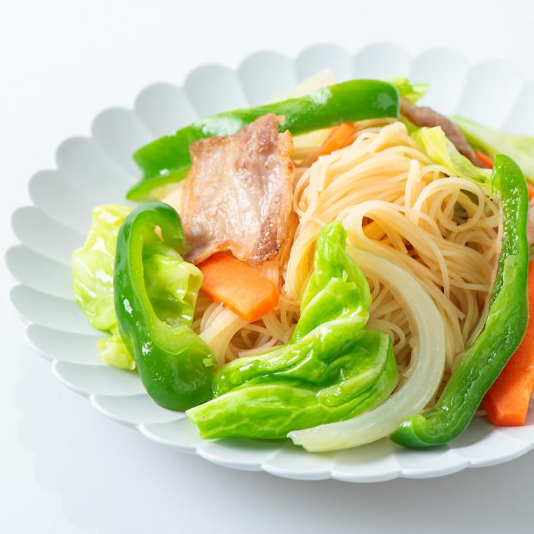 鹿児島県「南国元気鶏」の旨みたっぷりのだしスープと、久世福商店の「五島の塩」を使用した焼ビーフンです。