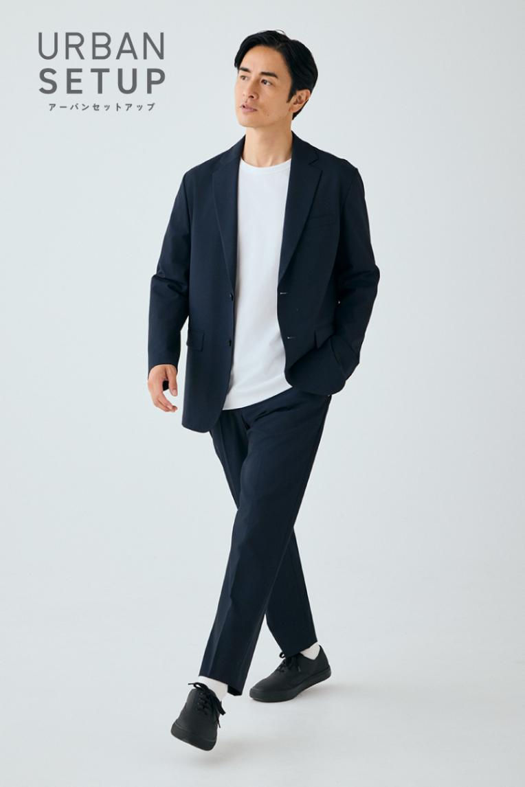 同素材のジャケットとのセットアップスタイルがおすすめです。