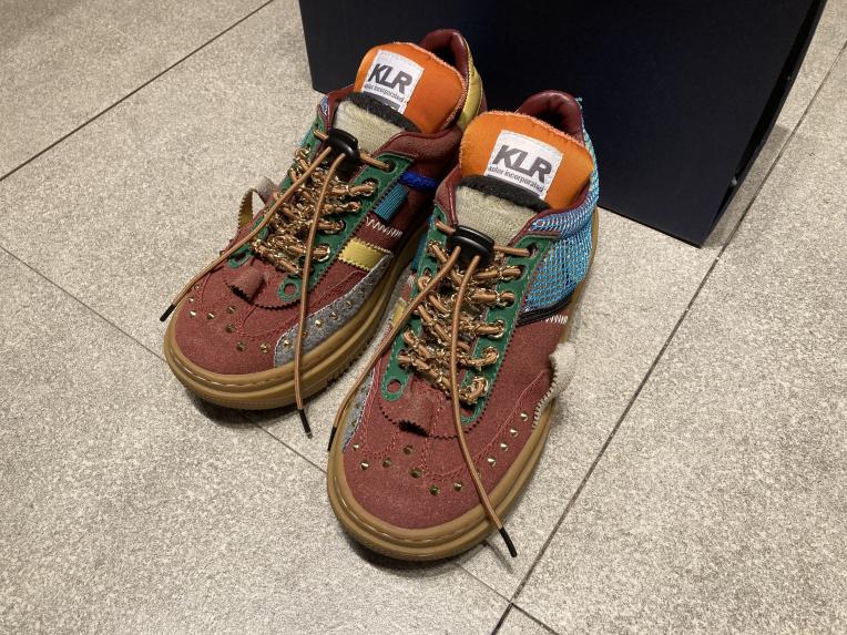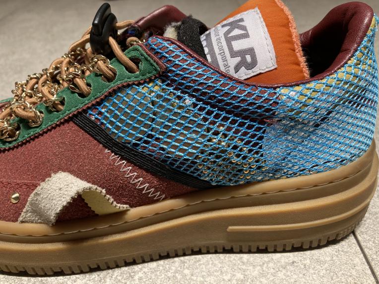 様々な素材と色を組み合わせたマルチカラーのデザインで、アッパーにはスタッズがあしらわれ、シューレスにはゴールドのチェーンが施されています。