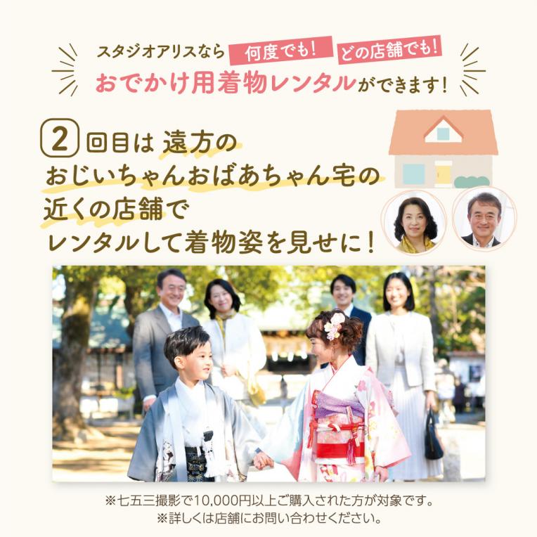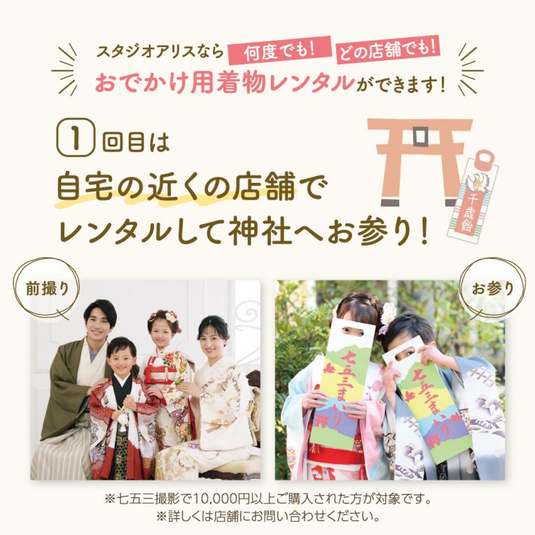 スタジオアリスなら何度でも!どの店舗でも!おでかけ用着物レンタルができます!