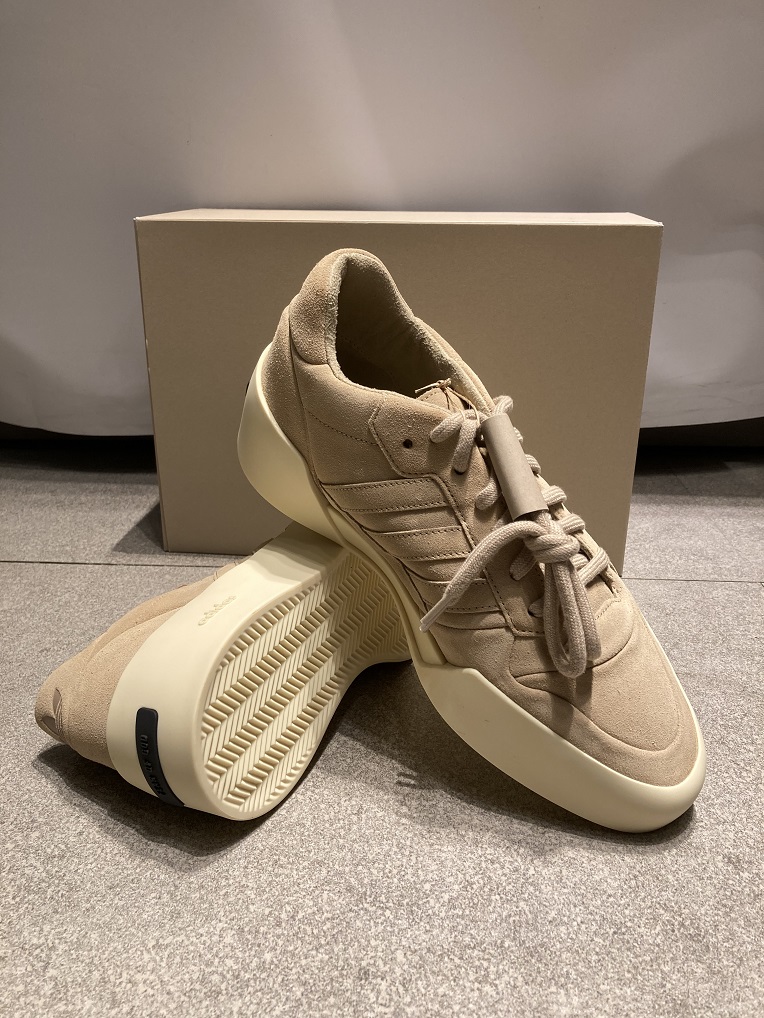 アッパーには柔らかなスウェードを贅沢に使用し、ブランドの特徴であるニュートラルなベージュトーンで統一。ヒールの『FEAR OF GOD』プレートと、ミニマムなラバーミッドソールが存在を静かに主張します。