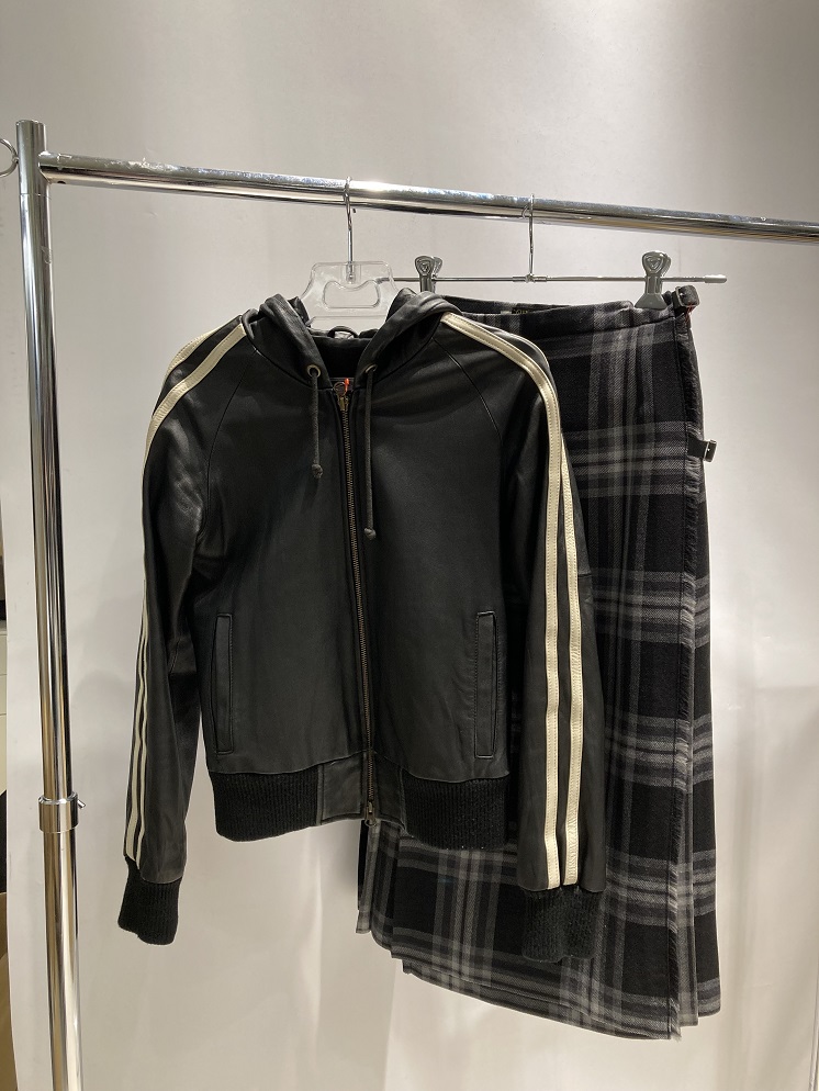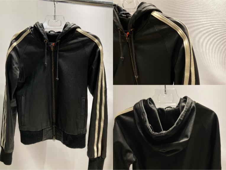 ジャケットはレザー素材で、袖にラインが入っておりトラックジャケットのようなデザインが可愛いアイテムです(^。^)