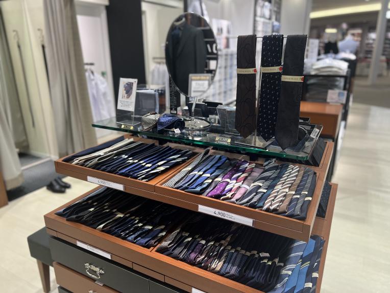 写真のように、上品な柄物や無地の美しいネクタイが充実しているため、