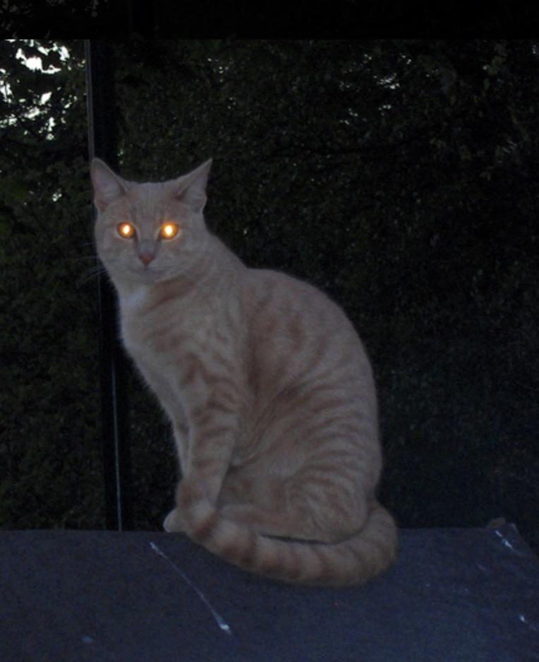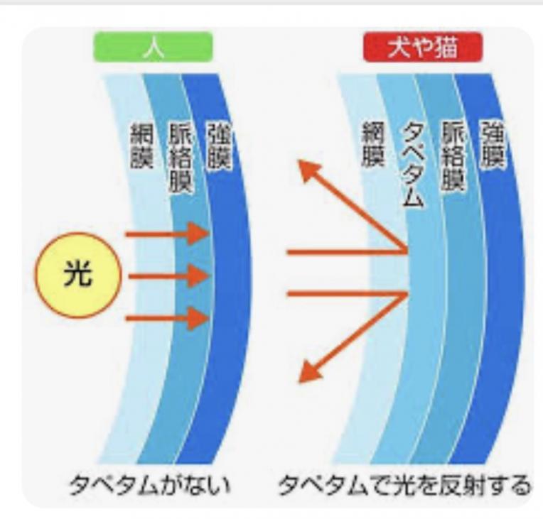 人にはこのタペタムはないので、写真などで目が赤く光っている人がたまにいるのは目の中の網膜にライトが反射しているので、犬猫とは別のものということになります。