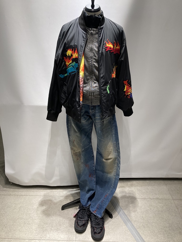 デザイン性のあるMA-1にインナーにトラックジャケットを取り入れることで首回りが寂しくならないようにスタイリングを組みました!
