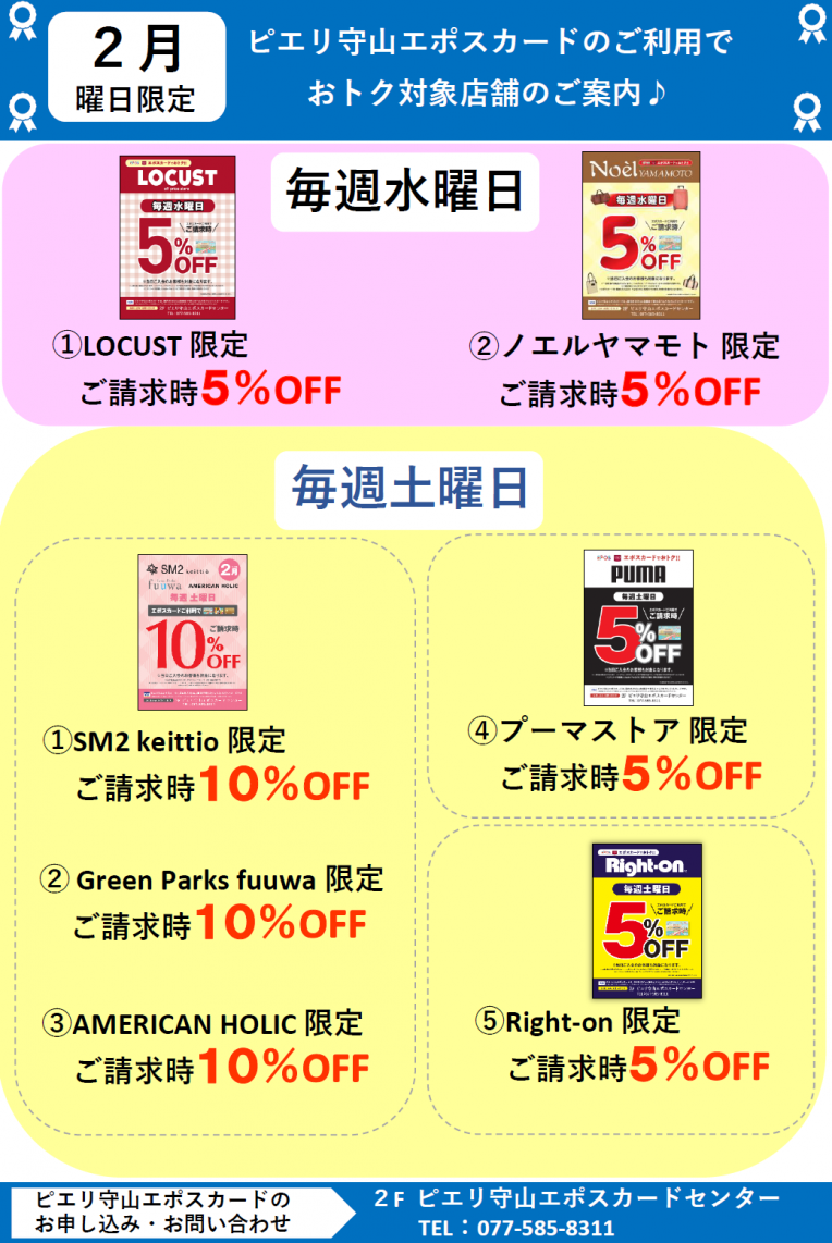 2月の毎週水曜日と毎週土曜日限定で、下記の対象店舗様でピエリ守山エポスカードを