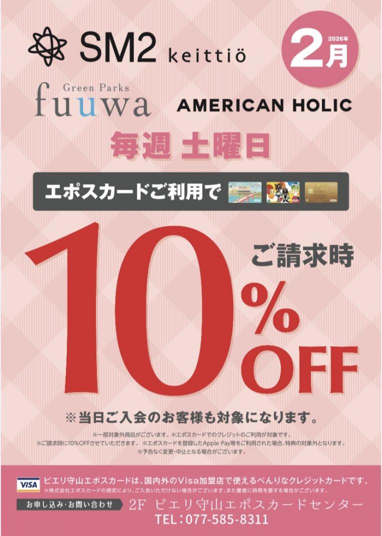 更に2月の毎週土曜日はエポスカード支払いで『10%OFF』イベントも開催中‼️※引き落とし時