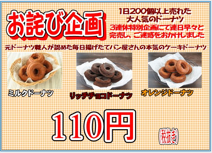 先日の3連休特別企画にて、1日の販売数が予想以上の人気で早々に完売しご迷惑をおかけしました。