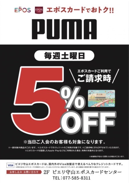 プーマストアでは、3月毎週土曜日エポスカードのご利用でご請求時に5%OFFのキャンペーンをおこなっております!