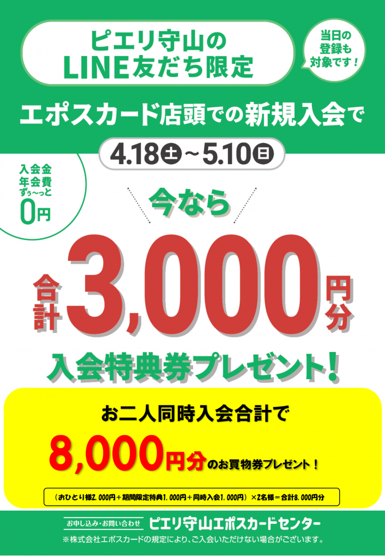 ピエリ守山エポスカード店頭での新規入会3,000円キャンペーン開催!!