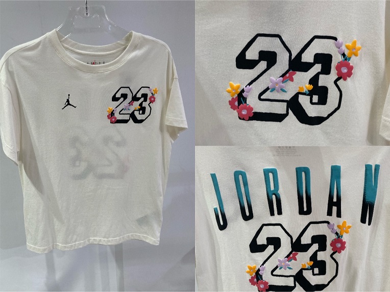 フロントにはアイコニックな23ナンバーとジャンプマンロゴを配置。立体感のあるフラワーモチーフがあしらわれ、ストリートな雰囲気に遊び心と可愛らしさをプラスした1枚です。