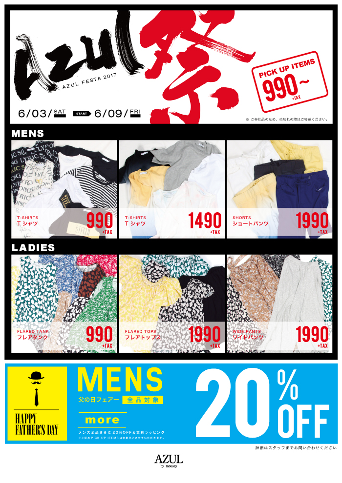 AZUL祭開催!!目玉商品&メンズ商品ALL20%OFF