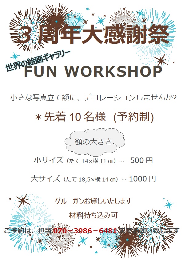 ピエリ店3周年祭を記念して、楽しいアトリエ「FUN WORKSHOP」始まります。正面入口からみえる2階ガラス張り「PIER」が目印です。午後5時までの御予約になります。(先着10名様まで,