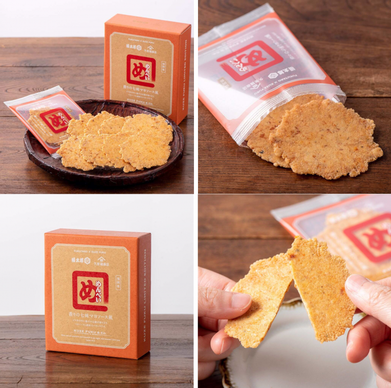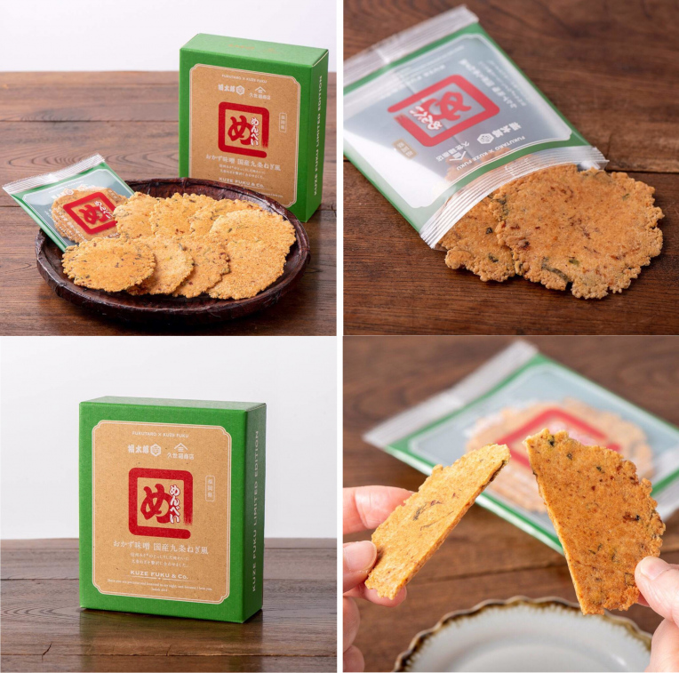 この 度のコラボでは、久世福商店の人気商品の味わいをめんべいで表現したいと1年がかりで開発、オリジナルめんべい2種類の味をご用意しました。